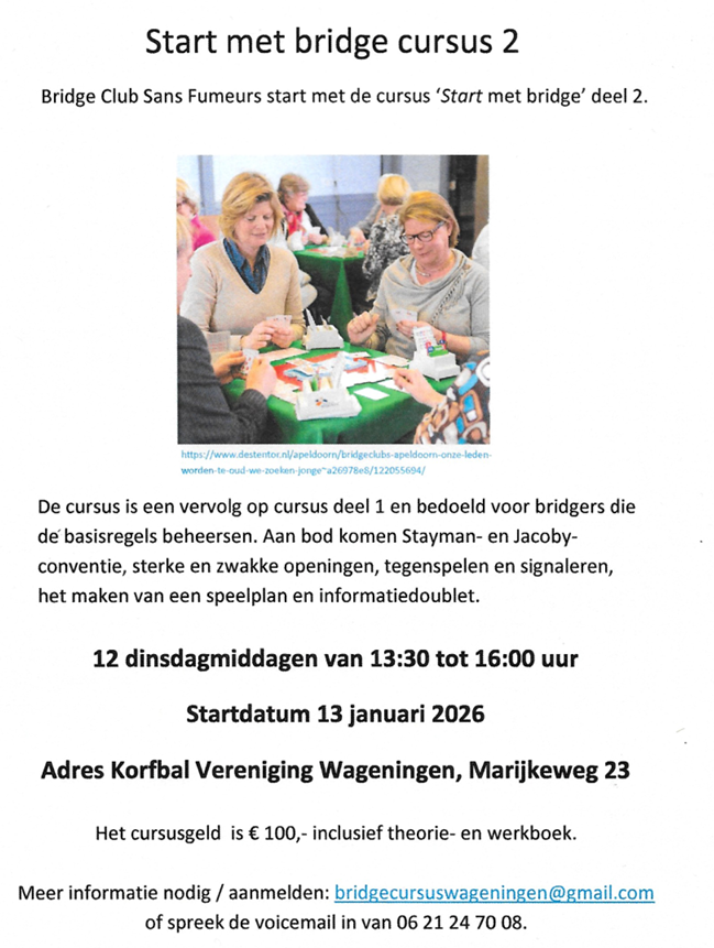 Meer informatie of aanmelden: bridgecursuswageningen@gmail.com of spreek de voicemail in van 06 21 24 70 08.